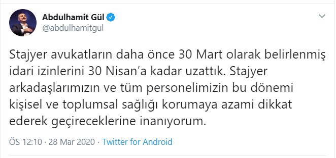Adalet Bakanı Abdulhamit Gül, Twitter hesabından yaptığı paylaşımla stajyer avukatların daha önce 30 Mart'a kadar verilen idari izinlerinin 30 Nisan'a kadar uzatıldığını bildirdi.