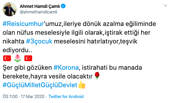 Cumhurbaşkanı Recep Tayyip Erdoğan'ın "en az 3 çocuk" sözlerini hatırlatan Çamlı, "Reisicumhurumuz,ileriye dönük azalma eğiliminde olan nüfus meselesiyle ilgili olarak,iştirak ettiği her nikahta 3 çocuk meselesini hatırlatıyor,teşvik ediyordu.." ifadelerini kullandı.