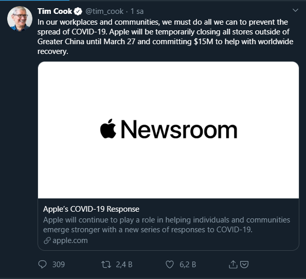 CEO Tim Cook tarafından paylaşılan açıklamada, virüsün dünya genelindeki etkisine dikkat çekildi.