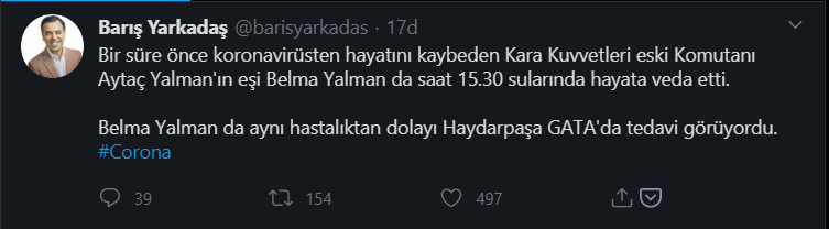 "Bir süre önce koronavirüsten hayatını kaybeden Kara Kuvvetleri eski Komutanı Aytaç Yalman'ın eşi Belma Yalman da saat 15.30 sularında hayata veda etti. Belma Yalman da aynı hastalıktan dolayı Haydarpaşa GATA'da tedavi görüyordu."