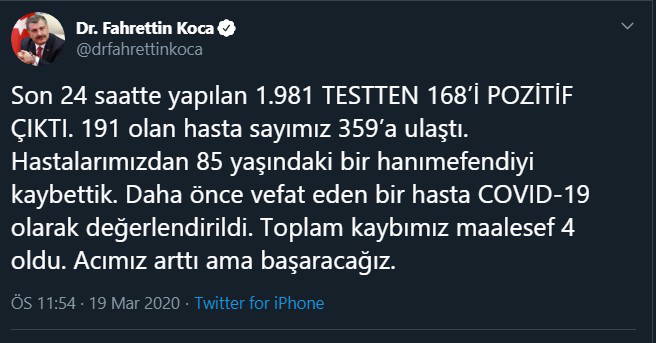 Bakan Koca Twitter'dan yaptığı açıklamada, ''Son 24 saatte yapılan 1981 testten 168’i pozitif çıktı. 191 olan hasta sayımız 359’a ulaştı. Hastalarımızdan 85 yaşındaki bir hanımefendiyi kaybettik. Daha önce vefat eden bir hasta COVID-19 olarak değerlendirildi. Toplam kaybımız maalesef 4 oldu. Acımız arttı ama başaracağız'' ifadelerini kullandı.