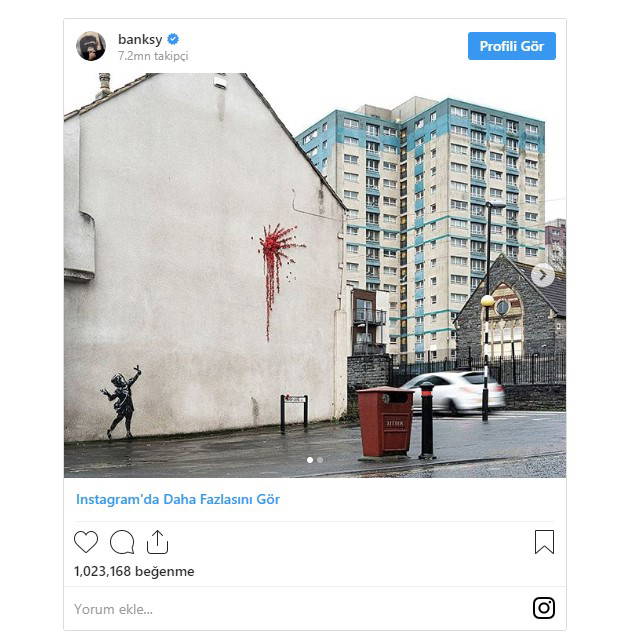 Sevgililer Günü nedeniyle yapıldığı düşünülen eserin kime ait olduğu bir süre gizemini korusa da Banksy’nin Instagram hesabından yaptığı paylaşım soru işaretlerini giderdi.