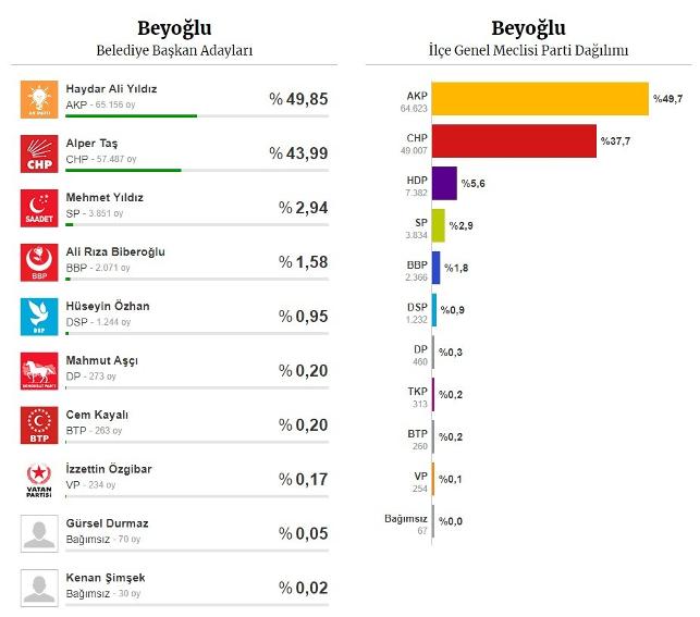 Anadolu Ajansı, sandıkların açıklamasının ardından sonuçları paylaşmaya başladı. Beyoğlu'nda gelen son sonuçlara göre AKP adayı Haydar Ali Yıldız önde %49,85 oy oranıyla önde görünüyor. CHP Adayı Alper Taş'ın oy oranı ise %43,99...