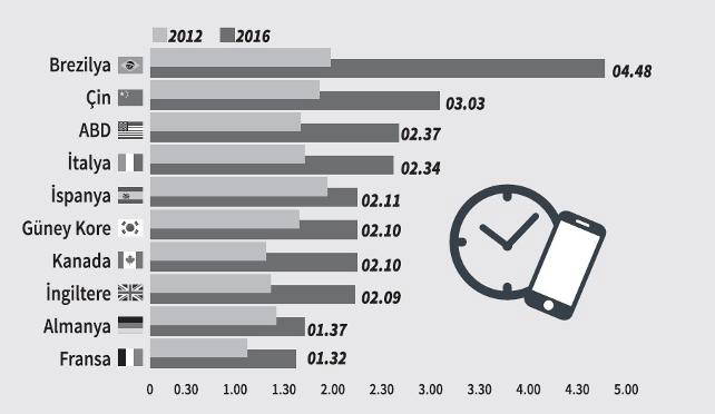 Grafikte 2012 yılından 2016 yılına kullanıcı başına akıllı telefon bağımlılığı verileri karşılaştırılıyor. Günde çevrimiçi geçirilen saat açısından en fazla kullanım verilerine sahip olan Brezilya’da ortalama bir kullanıcı, günde 2 saate yakın telefonuyla ilgilenirken bu rakam 2016’da 4 saat 48 dakikaya çıkmış durumda. Brezilya’nın ardından Çin ve ABD geliyor.