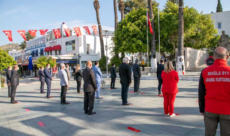 Törenin ardından ise belediye hoparlörlerinden Bodrum Belediye Başkanı Ahmet Aras'ın kutlama mesajı, çocuk şarkıları ve Atatürk'ün sesi yayınlandı.