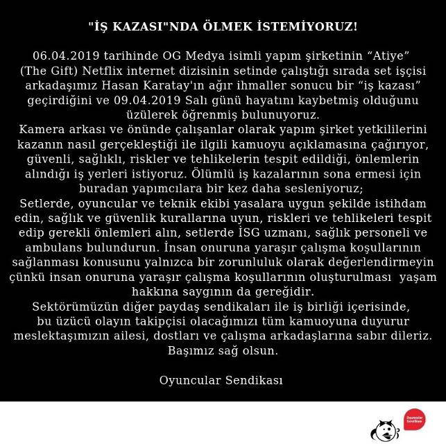 "06.04.2019 tarihinde OG Medya isimli yapım şirketinin "Atiye" (The Gift) Netflix internet dizisinin setinde çalıştığı sırada set işçisi arkadaşımız Hasan Karatay'ın ağır ihmaller sonucu bir "iş kazası" geçirdiğini ve 09.04.2019 salı günü hayatını kaybetmiş olduğunu üzülerek öğrenmiş bulunuyoruz.