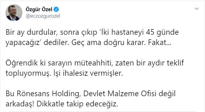 Sağlık Bakanı Koca’nın, söz konusu hastanelerin devlet imkanlarıyla yaptırılacağını açıkladığını anımsatan Özel, “Bir tek şey eksik. İhale nerede? Kim yaptı? Bu Rönesans Devlet Malzeme Ofisi değil. Sarayın müteahhiti” ifadelerini kullandı.