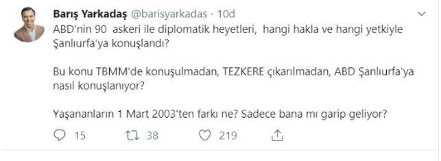 "ABD'nin 90 askeri ile diplomatik heyetleri, hangi hakla ve hangi yetkiyle Şanlıurfa'ya konuşlandı? Bu konu TBMM'de konuşulmadan, TEZKERE çıkarılmadan, ABD Şanlıurfa'ya nasıl konuşlanıyor? Yaşananların 1 Mart 2003'ten farkı ne? Sadece bana mı garip geliyor?"