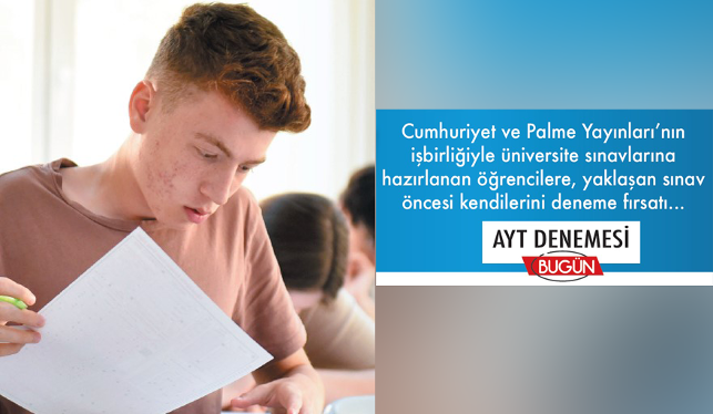 Cumhuriyet ve Palme Yayınları'nın işbirliğiyle üniversite sıavlarına hazırlanan öğrencilere yaklaşan sınav öncesi kendilerini deneme fırsatı... AYT denemesi bugün gazeteniz Cumhuriyet'le birlikte.