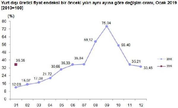 Türkiye İstatistik Kurumu (TÜİK) verilerine göre, YD-ÜFE Ocak ayında aylık bazda yüzde 1.83 gerilerken, bir önceki yılın Aralık ayına göre yüzde 1.83, bir önceki yılın aynı ayına göre yüzde 35.35 ve on iki aylık ortalamalara göre yüzde 37.57 arttı.