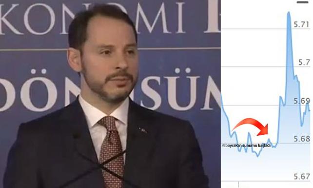 Hazine ve Maliye Bakanı Berat Albayrak beklenen sunumunu gerçekleştirirken dolar yükselişe geçti. Konuşma öncesi 5.67 olan dolar 5.71 sınırına ulaştı. Daha sonra düşüşe geçen dolarda dalgalanma sürüyor.