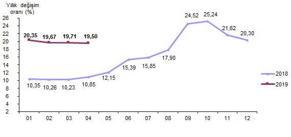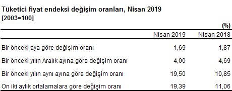 TÜFE'de (2003=100) 2019 yılı Nisan ayında bir önceki aya göre %1,69, bir önceki yılın Aralık ayına göre %4,00, bir önceki yılın aynı ayına göre %19,50 ve on iki aylık ortalamalara göre %19,39 artış gerçekleşti.