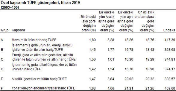 İşlenmemiş gıda ürünleri, enerji, alkollü içkiler ve tütün ile altın hariç TÜFE'de 2019 yılı Nisan ayında bir önceki aya göre %1,45, bir önceki yılın Aralık ayına göre %1,77, bir önceki yılın aynı ayına göre %16,78 ve on iki aylık ortalamalara göre %18,48 artış gerçekleşti.
