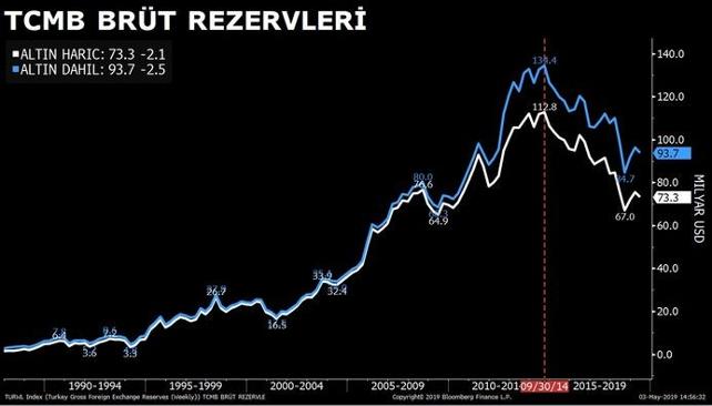 Böylece Merkez Bankasının toplam rezervleri, geçen hafta bir önceki haftaya kıyasla 2 milyar 230 milyon dolar azalarak 95 milyar 946 milyon dolardan 93 milyar 716 milyon dolara geriledi.