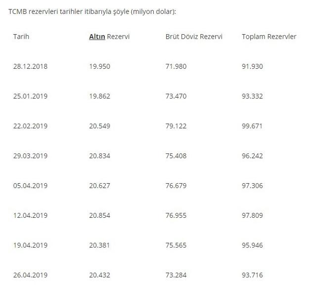 TCMB Haftalık Para ve Banka İstatistikleri'ne göre, 26 Nisan'da Merkez Bankası brüt döviz rezervleri, 2 milyar 281 milyon dolar azalışla 73 milyar 284 milyon dolar olarak gerçekleşti. Brüt döviz rezervleri, 19 Nisan ile biten haftada 75 milyar 565 milyon dolar seviyesindeydi.