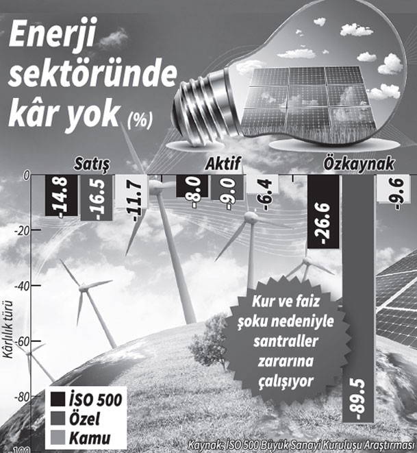 50 milyar dolarlık kredi borçlarını geri ödemekte büyük zorluk çeken enerji şirketleri, zararına çalışıyor. İstanbul Sanayi Odası (İSO) 500 verilerine göre, özel enerji şirketleri 2018'de ortalama olarak toplam aktif varlıklarının yüzde 9'u kadar zarar etti. Kamu enerji şirketi EÜAŞ da 2018'de 1.6 milyar vergi öncesi dönem zararı açıkladı ve aktif varlıklarının yüzde 6.4'ü kadar zarar etti. Özel enerji şirketlerinde özkaynak kârlılığı yüzde -89.5 ile çarpıcı seviyelere düştü.