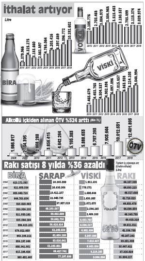 Alkolde vergi ve fiyatların artması nedeniyle yurttaş daha çok ucuz ürüne kaydı. Vergi avantajı nedeniyle ithal içkilerde patlama var. 2004’te Türkiye toplam 1 milyon 867 bin 673 litre viski ithal ederken 2018’de bu oran yüzde 385 artışla 9 milyon 48 bin 994 litreye yükseldi. Son 15 yılda viski alanında istikrarlı bir yükseliş söz konusu.