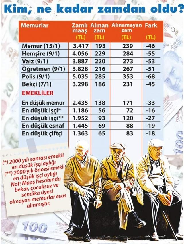 Yapılan zam oyunu nedeniyle en düşük dereceli memur aylık 46 lira, 6 aylık da 276 lira daha az zam aldı. Aynı şekilde en düşük memur emeklisinin aylık zam kaybı 33 lira, en düşük işçi emeklisinin zam kaybı 27 lira, öğretmenin zam kaybı 51 lira, polisin kaybı da 68 lira oldu. Eğer zamlar haziranda yapılmış olsaydı bu memurların maaşları bu tutarlarda yükseleceği için yeni yılda da yüksek maaş üzerinden zam alacaklardı.