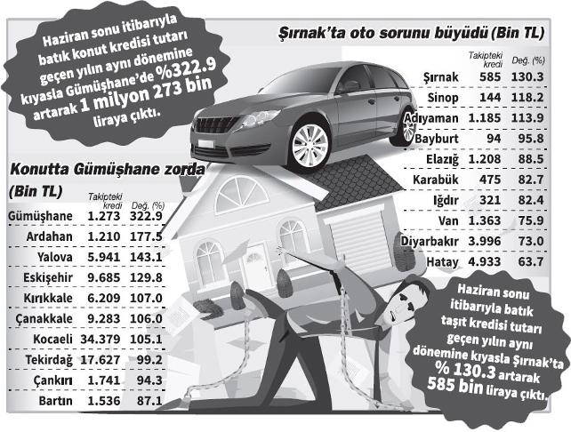 Taşıt kredilerinde ise en çok takipteki kredi tutarı 57.8 milyon lirayla yine İstanbul’da. Ancak geçen yılın haziran sonuna göre batık kredilerde yüzde 3.8 düşüş oldu. İstanbul’u yüzde 20.3 artışla 23.5 milyon liraya ulaşan Ankara ve yüzde 57.1 artışla 14 milyon liraya ulaşan Adana izliyor. En çok artış oranına sahip şehir ise yüzde 130 ile Şırnak (585 bin TL), en çok düşüş oranı ise yüzde 42.6 ile Edirne’de (602 bin TL).