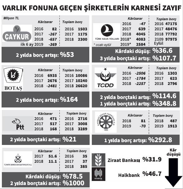 Türkiye Varlık Fonu’na (TVF) devredilen şirketlerin mali performanslarındaki başarısızlık dikkat çekiyor. TVF bünyesindeki Çaykur, Botaş, TCDD ve Kayseri Şeker zarar ederken, THY, Halkbank, Ziraat Bankası, Türkiye Denizcilik İşletmeleri ve PTT’nin kârlarında ciddi düşüşler kaydedildi. Fon bünyesindeki şirketlerin borçlarındaki büyük artışlar da dikkat çekiyor. Kurulduğundan bu yana kamunun değerli şirket ve arazilerini elinde toplayan fon, 1 milyar Avro’luk borçlanma ve İstanbul Finans Merkezi’ni 1.67 milyar TL bedelle satın almak dışında henüz bir faaliyette bulunmadı.