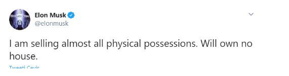 Musk, söz konusu paylaşımında neredeyse tüm eşyalarını satacağını ve artık ev sahibi olmayacağını açıkladı.