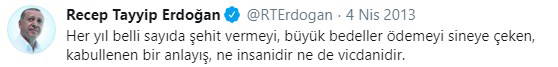 Erdoğan, 2013 yılında "Her yıl belli sayıda şehit vermeyi, büyük bedeller ödemeyi sineye çeken, kabullenen bir anlayış, ne insanidir ne de vicdanidir" açıklamasında bulunmuştu.