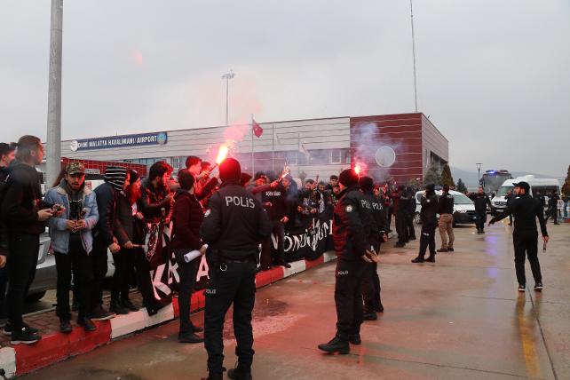 Malatya Stadyumu'nda yarın oynanacak karşılaşma için özel uçakla Malatya’ya gelen Beşiktaş kafilesini havaalanında yüzlerce taraftar meşalelerle karşıladı. Futbolcular ve Teknik Direktör Şenol Güneş’e sevgi gösterilerinde bulunan taraftarlar, tezahüratlarla takımlarına destek verdi.