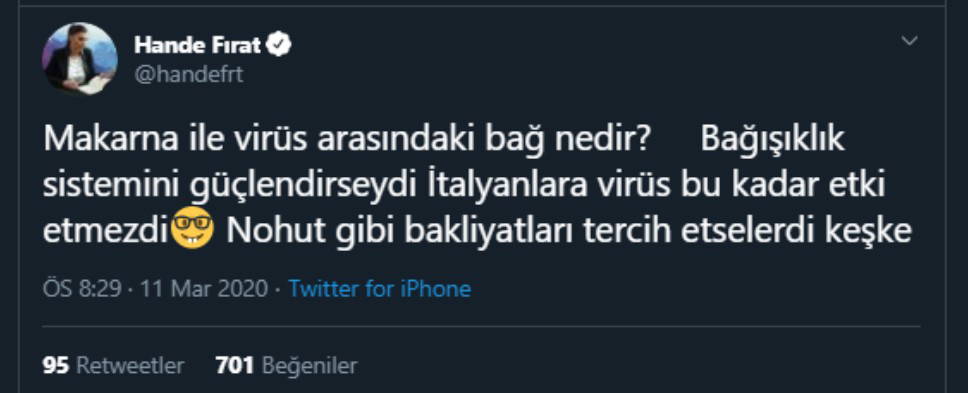 Hande Fırat paylaştığı tweette, "Makarna ile virüs arasındaki bağ nedir? Bağışıklık sistemini güçlendirseydi İtalyanlara virüs bu kadar etki etmezdi. Nohut gibi bakliyatları tercih etselerdi keşke" ifadelerini kullandı. Hande Fırat'ın kullandığı ifadelere birçok yurttaş tepki gösterdi.