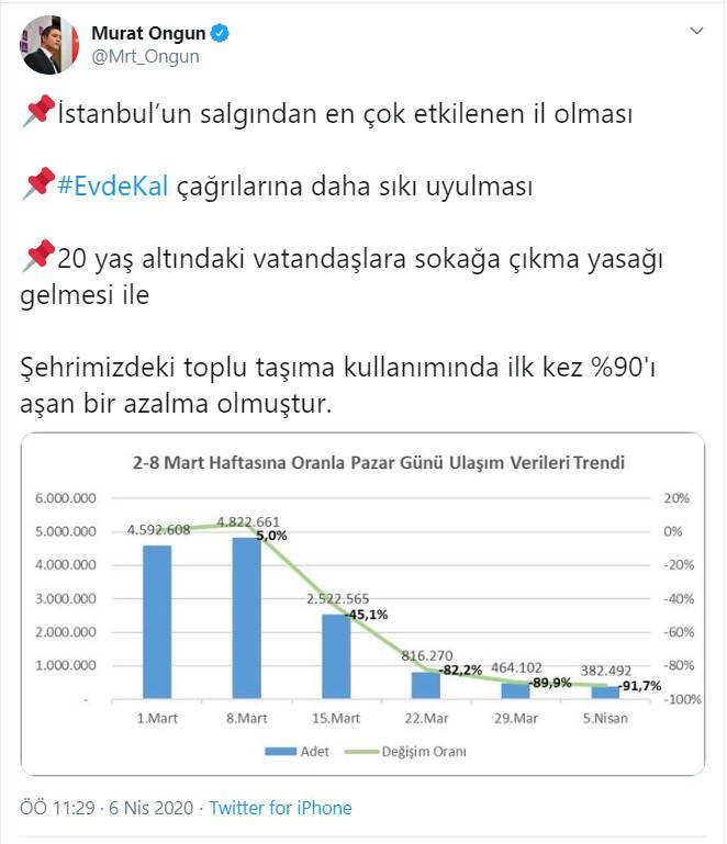 “İstanbul’un salgından en çok etkilenen il olması, Evde kal çağrılarına daha sıkı uyulması, 20 yaş altındaki vatandaşlara sokağa çıkma yasağı gelmesi ile şehrimizdeki toplu taşıma kullanımında ilk kez %90'ı aşan bir azalma olmuştur ”