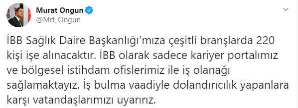 Twitter hesabı üzerinden duyuruda bulunan Ongun, "İBB Sağlık Daire Başkanlığı’mıza çeşitli branşlarda 220 kişi işe alınacaktır. İBB olarak sadece kariyer portalımız ve bölgesel istihdam ofislerimiz ile iş olanağı sağlamaktayız. İş bulma vaadiyle dolandırıcılık yapanlara karşı vatandaşlarımızı uyarırız" dedi.