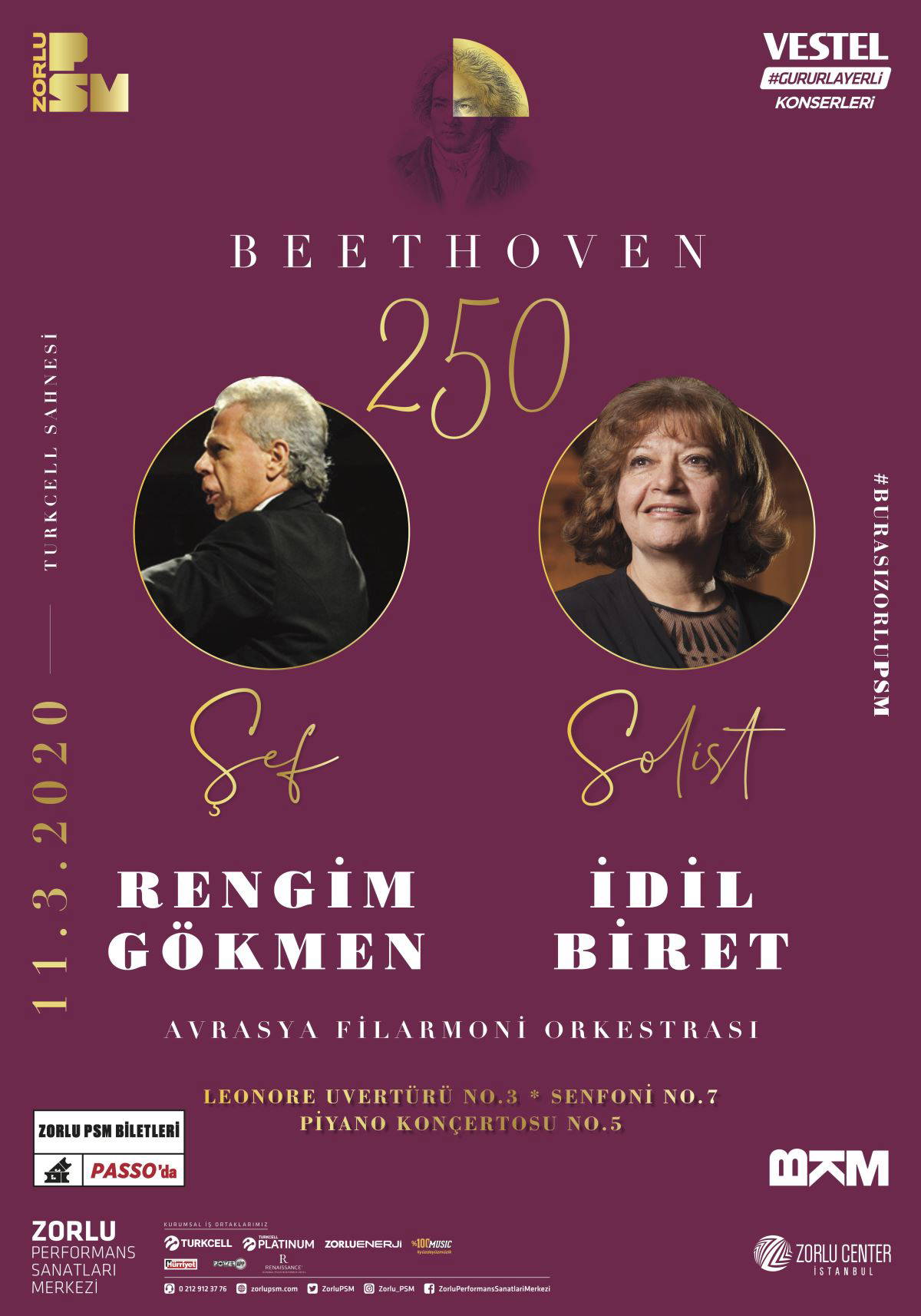 Müzik tarihininin en büyük dehalarından Ludwig van Beethoven'ın 250. Doğum Yılı Özel Konseri, devlet sanatçısı şef Prof.Rengim Gökmen yönetiminde, dünyaca ünlü piyanist İdil Biret'in solistliğinde ve Avrasya Filarmoni Orkestrası eşliğinde Zorlu PSM - BKM iş birliğiyle 11 Mart gecesi Turkcell Sahnesi’nde müzikseverlerle buluşacak.