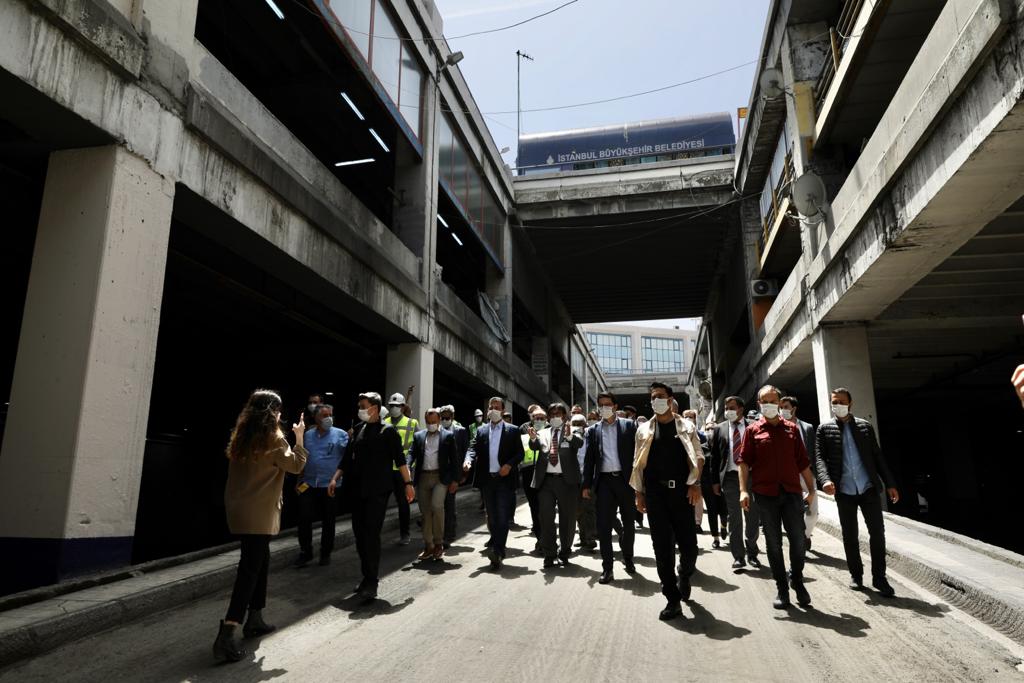 Otogar Genel Müdürü Fahrettin Beşli’den çalışmalarla bilgi alan İmamoğlu; istasyon binası, kuleler, peronlar, tamir bakım merkezi, Hamidiye Caddesi ve lojistik alanlarını dolaşarak, çalışmaları yerinde denetledi ve işçileri selamladı.