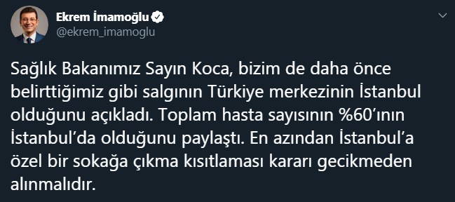 Sağlık Bakanı Koca’nın açıklamasının ardından Twitter hesabından paylaşım yapan İBB Başkanı Ekrem İmamoğlu, en azından İstanbul’a özel sokağa çıkma kısıtlaması kararının gecikmeden alınması gerektiğini belirtti.