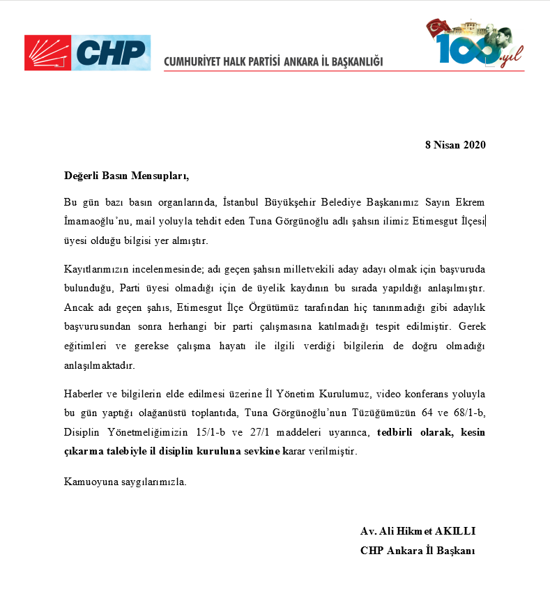 "Bu gün bazı basın organlarında, İstanbul Büyükşehir Belediye Başkanımız Sayın Ekrem İmamaoğlu’nun, mail yoluyla tehdit eden Tuna Görgünoğlu adlı şahsın ilimiz Etimesgut İlçesi üyesi olduğu bilgisi yer almıştır.