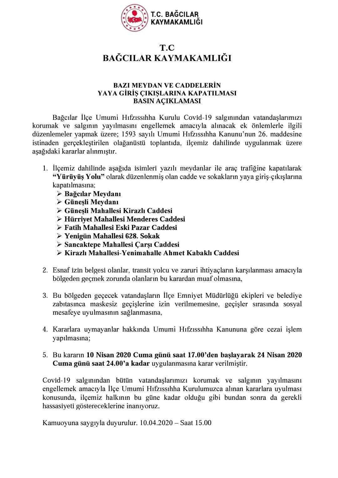 Yapılan duyuruda, yaya giriş-çıkışlarına kapatılan lokasyonlar, "Bağcılar Meydanı, Güneşli Meydanı, Güneşli Mahallesi Kirazlı Caddesi, Hürriyet Mahallesi Menderes Caddesi, Fatih Mahallesi Eski Pazar Caddesi, Yenigün Mahallesi 628. Sokak, Sancaktepe Mahallesi Çarşı Caddesi, Kirazlı Mahallesi-Yenimahalle Ahmet Kabaklı Caddesi" olarak sıralandı.