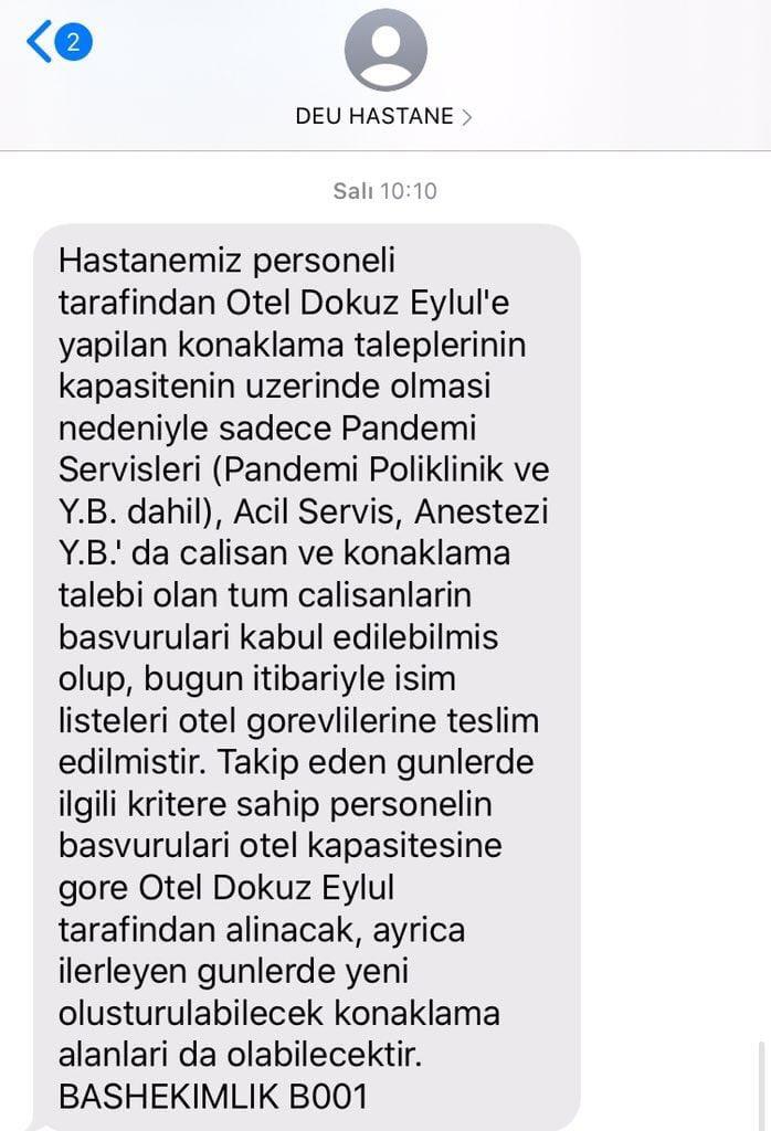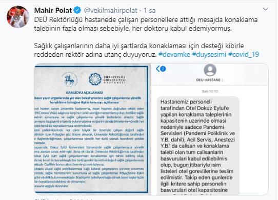 Polat, sosyal medya hesabından sağlık emekçilerine gelen mesajın görselini paylaşarak, "DEÜ Rektörlüğü hastanede çalışan personellere attığı mesajda konaklama talebinin fazla olması sebebiyle, her doktoru kabul edemiyormuş. Sağlık çalışanlarının daha iyi şartlarda konaklaması için desteği kibirle reddeden rektör adına utanç duyuyoruz."