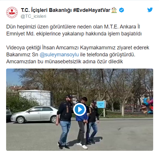İçişleri Bakanlığı'ndan yapılan açıklamada, "Dün hepimizi üzen görüntülere neden olan M.T.E. Ankara İl Emniyet Md. ekiplerince yakalanıp hakkında işlem başlatıldı. Videoya çektiği İhsan Amcamızı Kaymakamımız ziyaret ederek Bakanımız Sayın @suleymansoylu ile telefonda görüştürdü. Amcamızdan bu münasebetsizlik adına özür diledik" denildi.