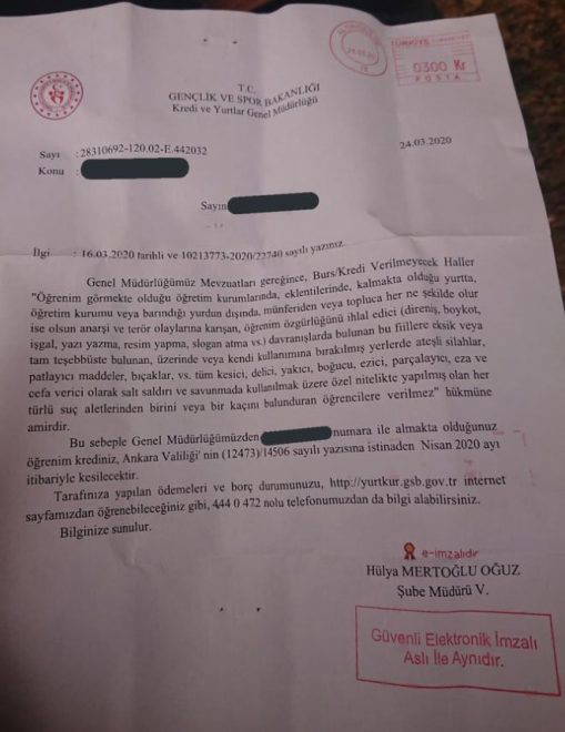 Anka Haber Ajansı’nın haberine göre, öğrenciye iletilen tebligatta ”öğrenim hakkını engelleyici eyleme” katıldığı ifade edilirken, ”Öğrenim krediniz Ankara Valiliği’nin yazısına istinaden Nisan ayı itibarıyla kesilecektir” denildi.