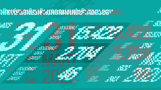 Tabloya göre, toplam test sayısı 92 bin 403 , toplam vaka sayısı 13 bin 531, toplam yaşamını yitirenlerin sayısı 214, toplam yoğun bakım hasta sayısı 847, toplam entübe hasta sayısı 622, toplam iyileşen hasta sayısı 243 oldu.