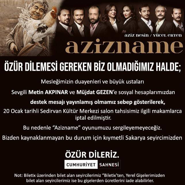 Özür dilemesi gereken biz olmadığımız halde; Mesleğimizin duayenleri ve büyük ustaları Metin Akpınar ve Müjdat Gezen’e sosyal medya hesaplarımızdan destek mesajı yayımlamış olmamız sebep gösterilerek, 20 Ocak tarihli Sedirvan Kültür Merkezi salon tahsisimiz ilgili makamlarca iptal edilmiştir. Bu nedenle "Azizname" oyununu sergileyemeyeceğiz. Bizden kaynaklanmayan bu durum için kıymetli Sakarya seyiricimizden özür dileriz.