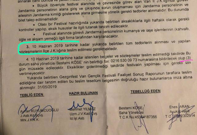 Aynı açıklamada şu hususa da dikkat çekiliyor: “Tüm Türkiye’de 24 saat önce hazırlanan festival alanı, 20 gün önce hazırlanması talep edilmiş. Buna rağmen daha önce hiçbir festivalimizde yapmadığımızı yapıp alana tuvaletler satın alınmış, standlar konulmuştur. Festivallerimizin olmazsa olmazı olan çit, otopark, X-ray gibi son 1 günde yapılması gereken talepler çözüm üretilmek yerine, eksik görülerek festivalimizin iptal edilmesine sebep gösterilmiştir. Festivalimizin iptal tarihi ise taleplerin karşılanması için verilen süreden 7 gün öncedir. Olası eksiklikler için 13 Haziran’a kadar süremiz olmasına rağmen resmi tatilde festivalimizin iptali açıklanmıştır.