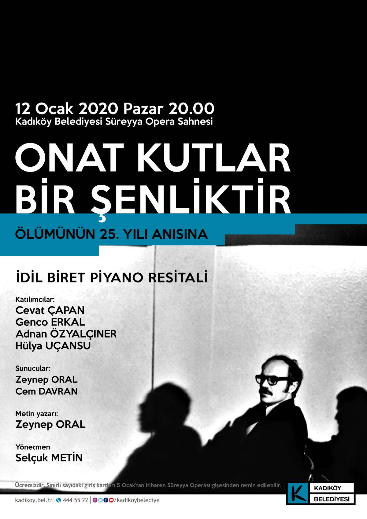 11 Ocak 1995’te uğradığı bombalı saldırı sonucu 59 yaşında hayatını kaybeden şair, yazar, sinema eleştirmeni ve Türk Sinematek Derneği kurucularından Onat Kutlar anısına düzenlenen gece Kadıköy Belediye Başkanı Şerdil Dara Odabaşı’nın açılış konuşmasıyla başlayacak. “Onat Kutlar Bir Şenliktir” anma programında Hülya Uçansu, Adnan Özyalçıner, Türk Sinematek Derneği kurucularından Cevat Çapan konuşma yapacak ve sanatçı Genco Erkal Kutlar’ın eserlerinden bölümler okuyacak. Zeynep Oral ile Selçuk Metin’in hazırladığı; Zeynep Oral ve Cem Davran’ın sunuculuğunu yaptığı gece piyanist İdil Biret’in vereceği resitalle son bulacak.