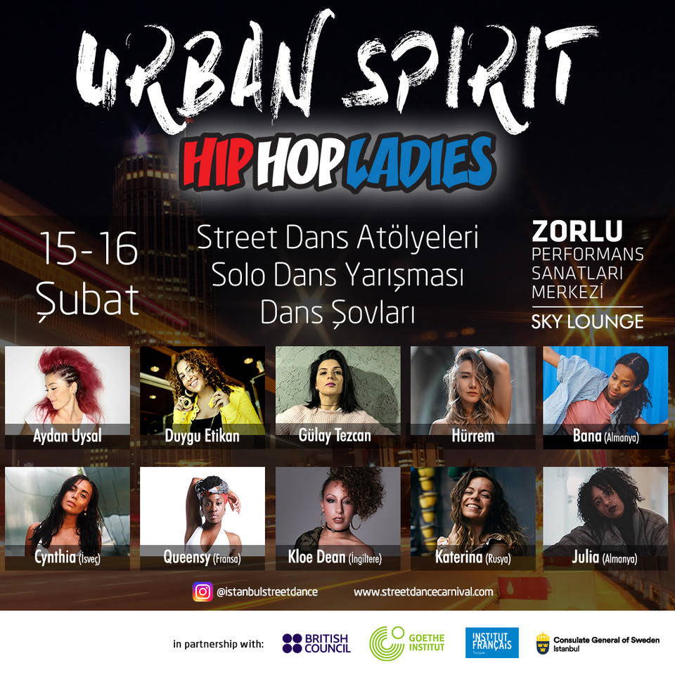 Urban Spirit - HipHop'un Dansçı Kadınları ilk olarak geçtiğimiz sene İstanbul, Ankara, İzmir ve Gaziantep’de, dansta cinsel ayrımcılığı vurgulamak, dansla birlikte kız çocukları ve kadınlara kendilerini daha iyi ifade edebilecekleri bir platform yaratmak amacıyla ortaya çıkmış bir projedir. Proje kapsamında bir araya gelen geleceğin kadınları, başarılı ve tecrübeli kadın dans eğitmenleri ile çalışmalar gerçekleştirerek yaratıcılıklarını özgürce ortaya çıkarma imkanı buluyorlar. Eğitmenler dans atölyelerinin yanı sıra sokak dansları türlerini kullanarak, dans terapisinin temellerini oluşturan hareket ile mekan bütünlüğü, beden ve zihin bağlantısı gibi yaratıcı hareket çalışmaları yapıyorlar.