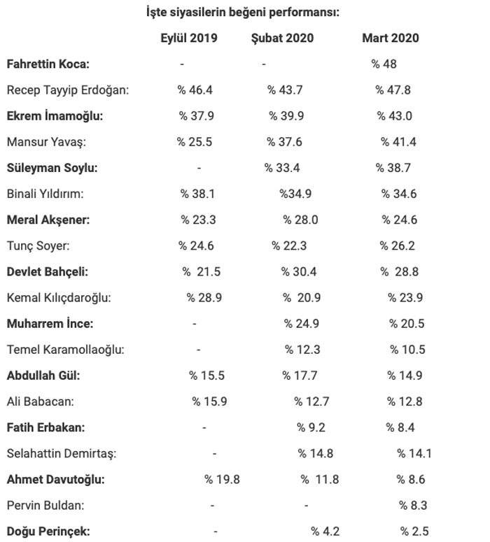 Araştırmada performansı beğenilen liderler arasında Sağlık Bakanı Fahrettin Koca sürprizi yaşandı. Koca, yüzde 48 beğenilme oranıyla Cumhurbaşkanı Recep Tayyip Erdoğan’ı da geçerek birinci sırada yer aldı. Erdoğan ankette yüzde 47.8 oy aldı.