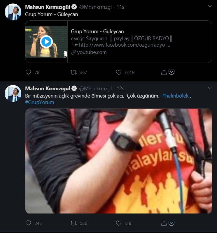 Yönetmen ve şarkıcı Mahsun Kırmızıgül, ölüm orucunun 288. gününde hayatını kaybeden Grup Yorum üyesi Helin Bölek için Twitter hesabından paylaşım yaptı.