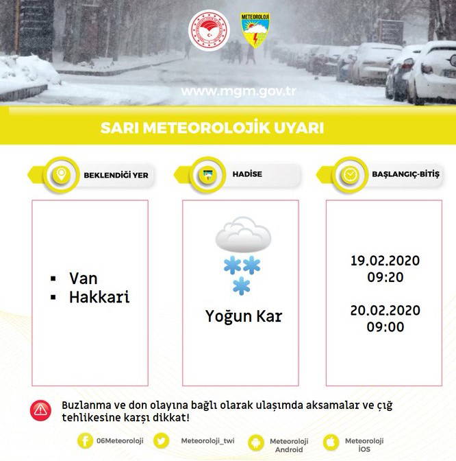 "Yapılan son değerlendirmelere göre; Doğu Anadolu'nun güneydoğusunda başlayan kar yağışlarının, Hakkari il geneli ile Van'ın güney ilçelerinde, yarın (Perşembe) sabah saatlerine kadar yoğun (20 -50 cm) olarak devam etmesi beklendiğinden başta buzlanma ve don olayına bağlı olarak ulaşımda aksamalar ve çığ tehlikesine karşı dikkatli ve tedbirli olunması gerekmektedir" denildi