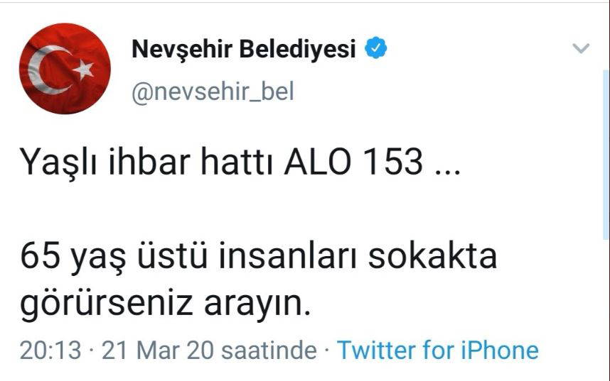Nevşehir Belediyesi, İçişleri Bakanlığı'nın 65 yaş üstü kişilere ve kronik hastalara dışarı çıkma yasağı getirmesinin ardından 'Yaşlı İhbar Hattı' oluşturdu. Nevşehir Belediyesi resmi Twitter hesabından yapılan duyuruda, dışarıda 65 yaş üstü kişileri görenlerin ALO 153'ü aramları istendi. Belediye, 'ihbar' ibaresi yanlış bulununca hattı, "Yaşlı Destek Hattı' olarak değiştirdi.
