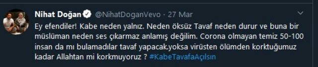 Doğan, ''“Ey efendiler, Kabe neden yalnız! Neden öksüz! Tavaf neden durur ve buna bir müslüman neden ses çıkarmaz anlamış değilim. Corona virüsü olmayan temiz 50-100 insan da mı bulamadılar tavaf yapacak? Yoksa virüsten ölümden korktuğumuz kadar Allah'tan mı korkmuyoruz?” ifadelerini kullandı.