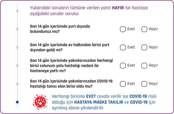 Bakanlığın Kovid-19 sorgulama kılavuzuna göre, ateşi veya öksürük, sadece öksürük, nefes darlığı ve nefes almakta zorluk şikayetlerinden herhangi birisi varsa, hastaya maske takılacak ve Kovid-19 için ayrılmış alana yönlendirilecek.