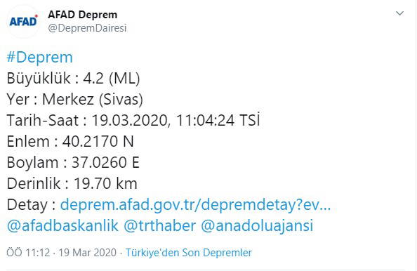 AFAD sosyal medya hesabı Twitter üzerinden merkez üssü Sivas olan 4.2 büyüklüğünde deprem meydana geldiğini duyurdu.